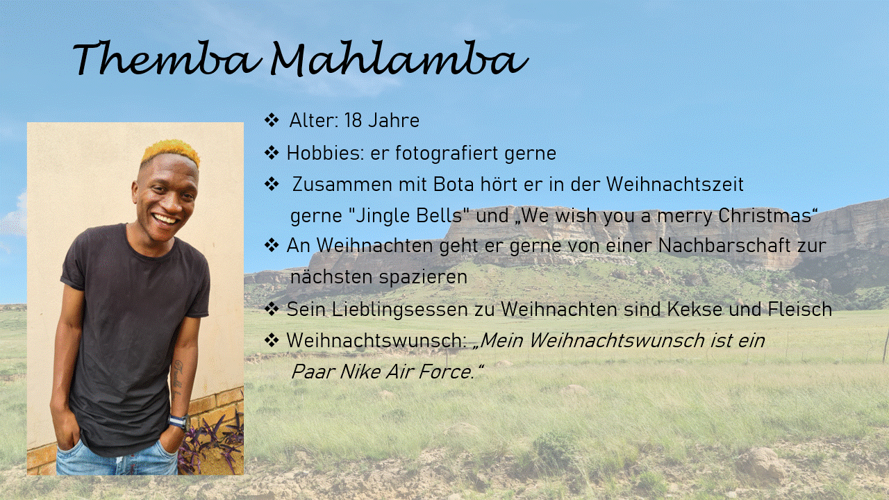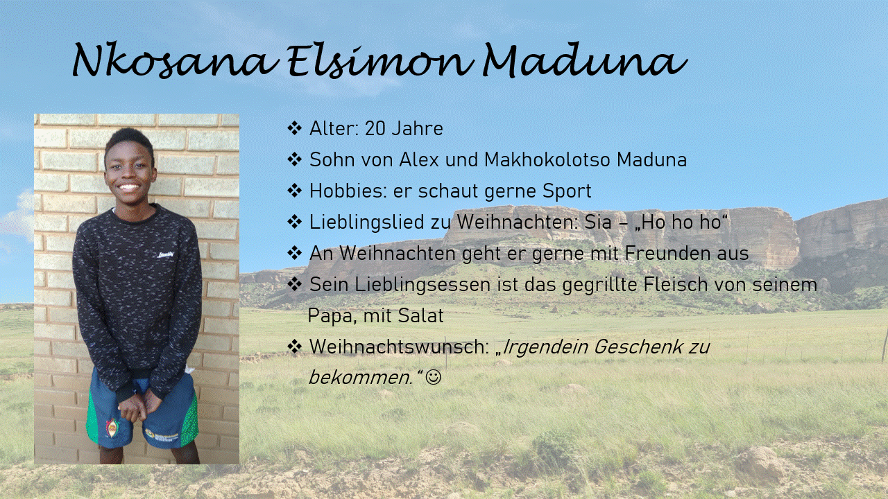 Wie seine Eltern Alex und Makhokolotso ist Nkosana eine großartige Unterstützung vor Ort. Mehr über Nkosana und seinen Weihnachtswunsch könnt ihr in seinem Steckbrief nachlesen: