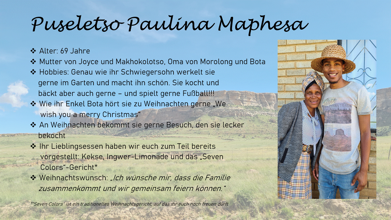 Passend dazu teilt Puseletso, die Oma unseres Vorstandes Morolong, hinter dem heutigen Türchen ihr Lieblingsgetränk mit uns – und das ist nicht nur im Sommer ein echter Genuss…